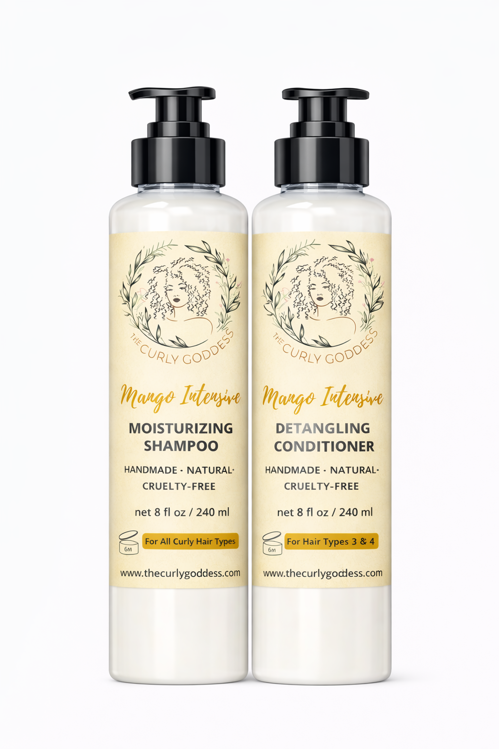 Meet the duo every Curly Goddess needs. Infused with nourishing mango butter, this system delivers deep moisture, slip, and shine while melting through tangles. Gentle, hydrating, and perfect for curls that crave softness and definition. Ideal for daily use and all curl types.